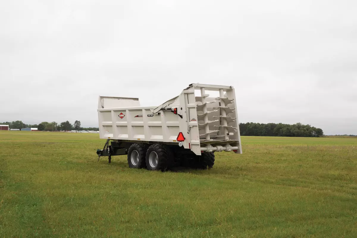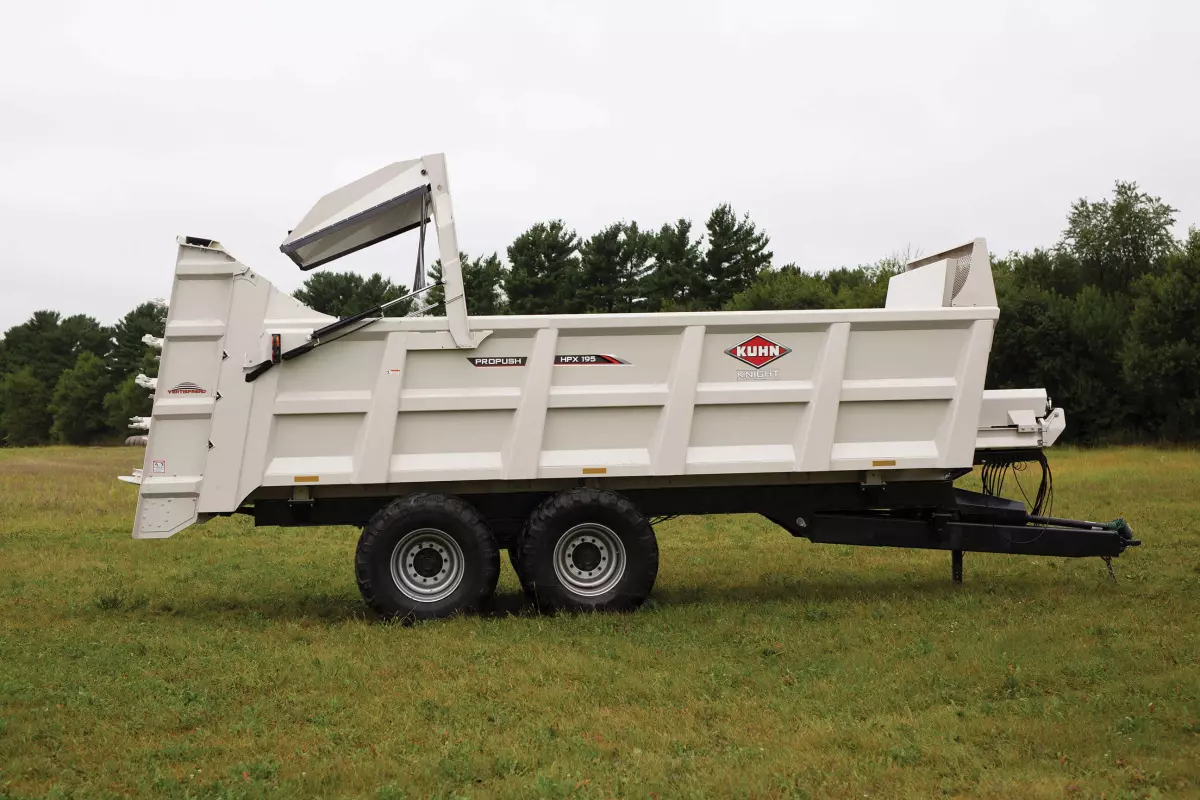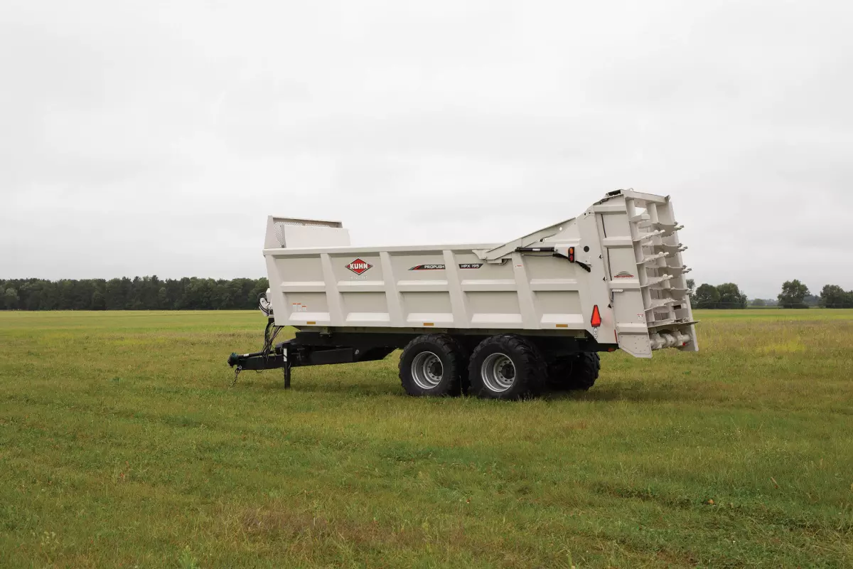 Le HPX 195 dispose de parois latérales calibrées à 10 et d’un revêtement en polyuréthane de 1/4 po (0,64 cm). Une construction soudée tout en acier assure un cadre solide. Des rails latéraux profilés soutiennent les parois latérales du boîtier. L’évasement des parois facilite le chargement et permet à l’opérateur de maintenir une distance confortable de l’appareil pendant le chargement.