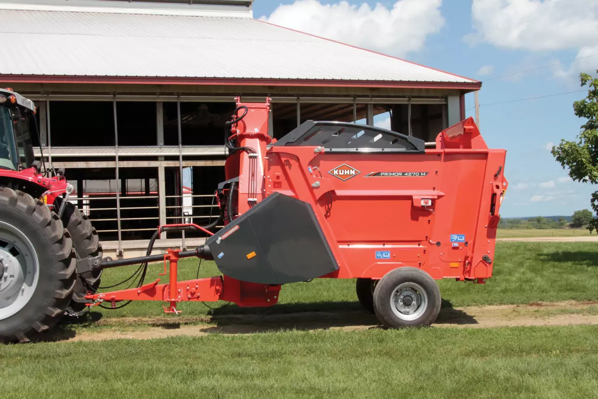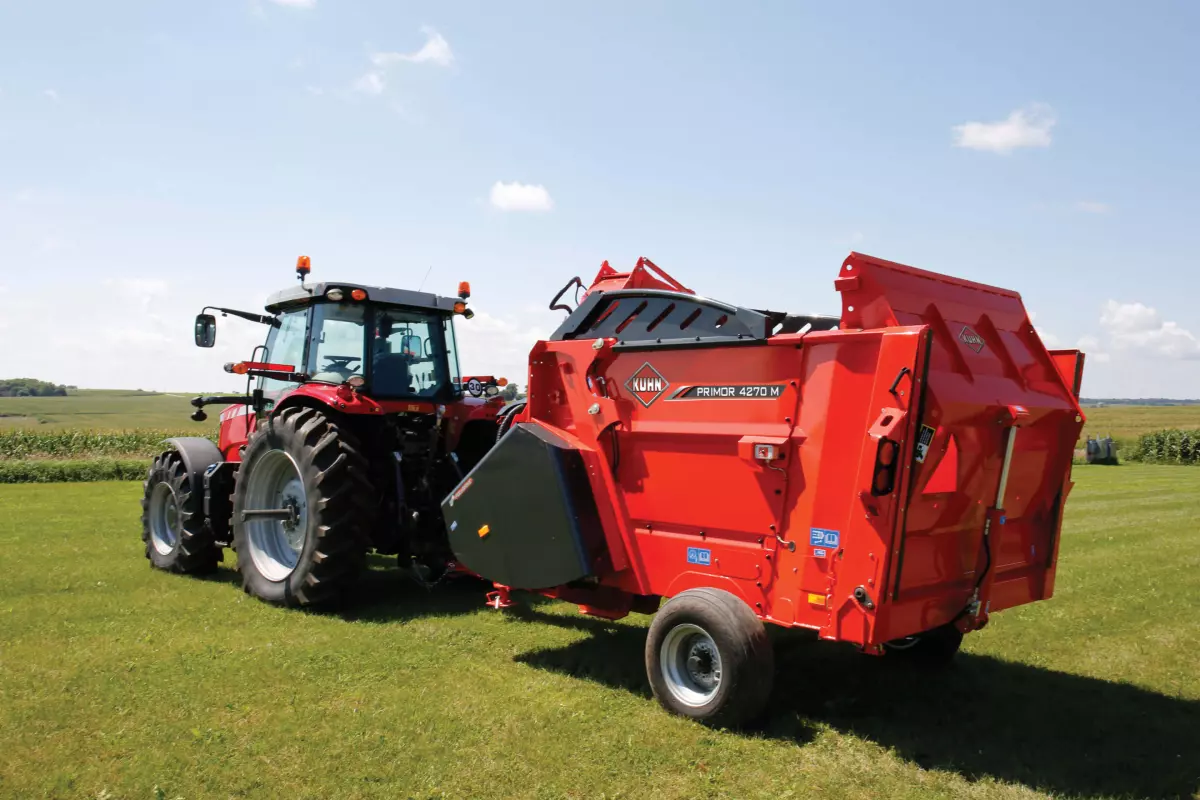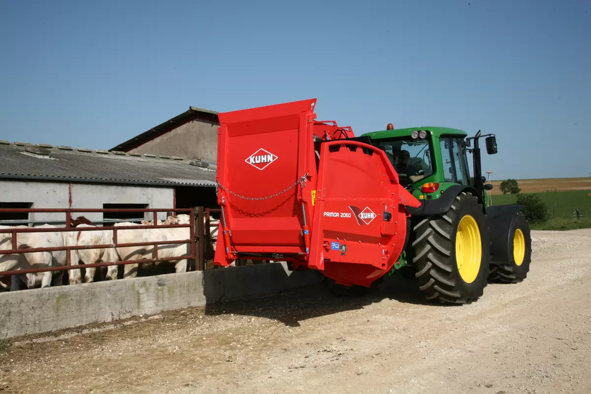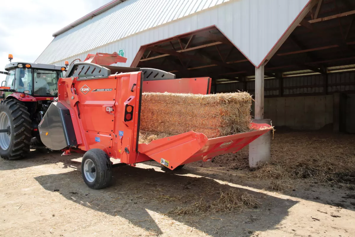 Les machines Primor de KUHN peuvent traiter une grande variété de matières qui peuvent être utilisées de multiples façons. Des balles rondes et carrées de différentes tailles peuvent être transformées en matières pour la litière ou en ingrédients d’aliments pour animaux. Le rotor multifonctionnel permet de traiter des matières allant des tiges de maïs à la paille de blé, et même au foin herbeux. Les matières traitées peuvent ensuite être déposées dans une mangeoire, soufflées en tas ou réparties uniformément dans un enclos.