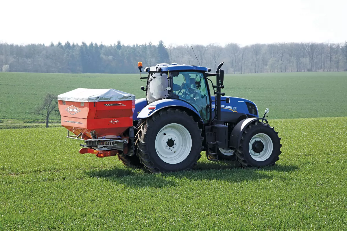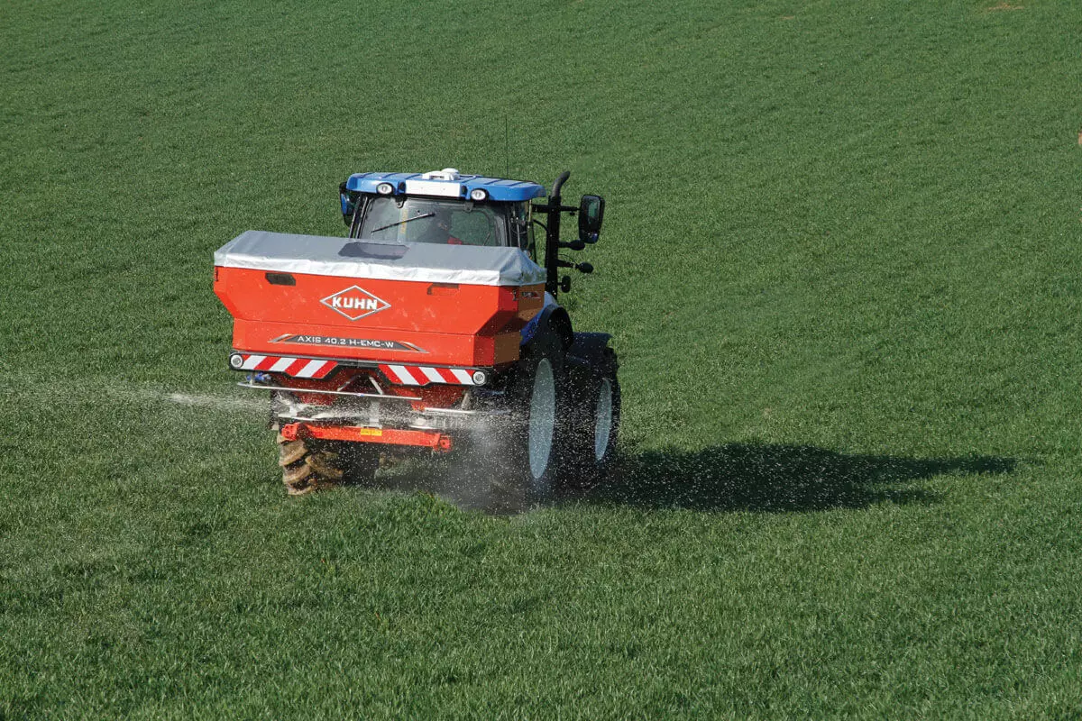 Vous pouvez modifier la largeur de travail en quelques secondes par l’ajustement du point de chute de l’engrais sur le disque. Cela se fait sans aucun outil, en faisant pivoter la base depuis la cabine, par l’entremise de l’afficheur ISOBUS. Il n’y a aucune palette à ajuster, et aucun contact manuel avec l’engrais n’est requis.